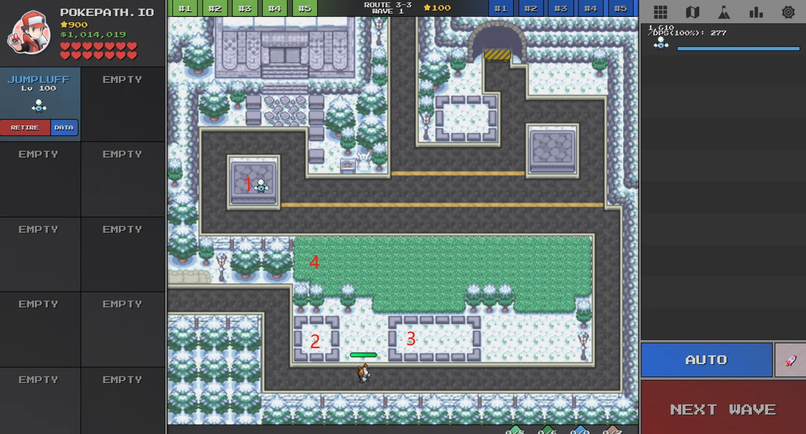 Tower positions used for DPS testing. Position 1 (center), Position 2 (Gengar), Position 3 (Noivern), Position 4 (Lilligant)